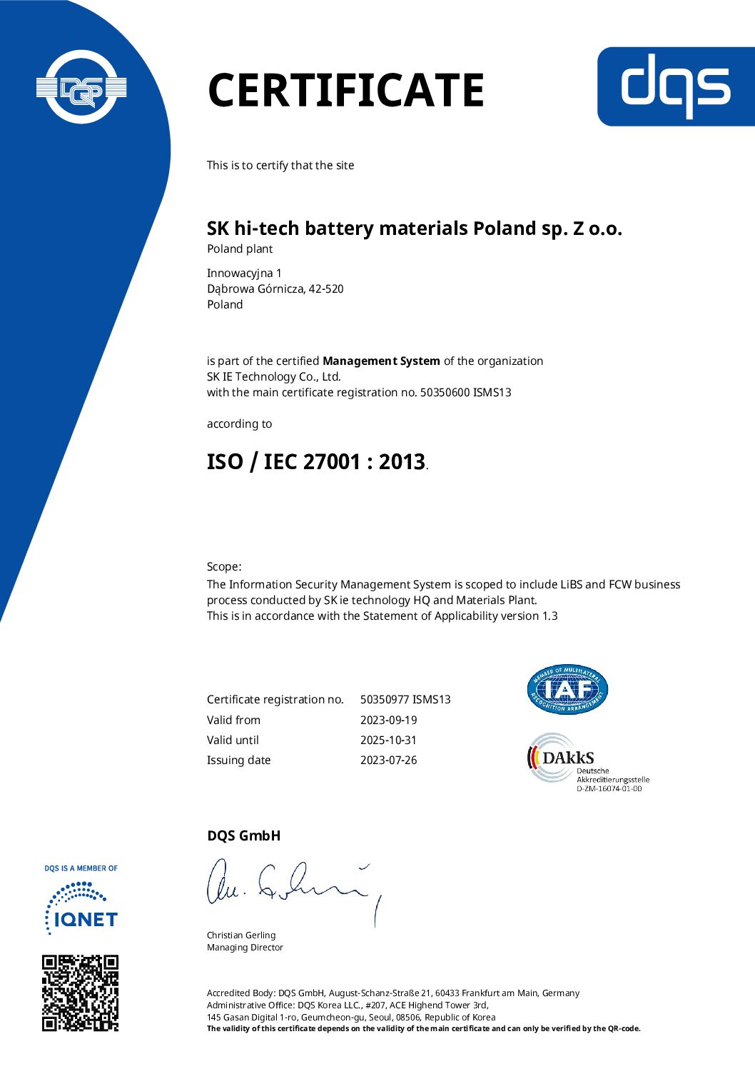 SK hi-tech battery materials Poland with ISO/IEC 27001 certificate! We are extremely proud to share such great news with you! In our opinion, information security is a key factor in building trust in an organization. What exactly is this certificate? ISO/IEC 27001 is an international standard that standardizes information security management systems.